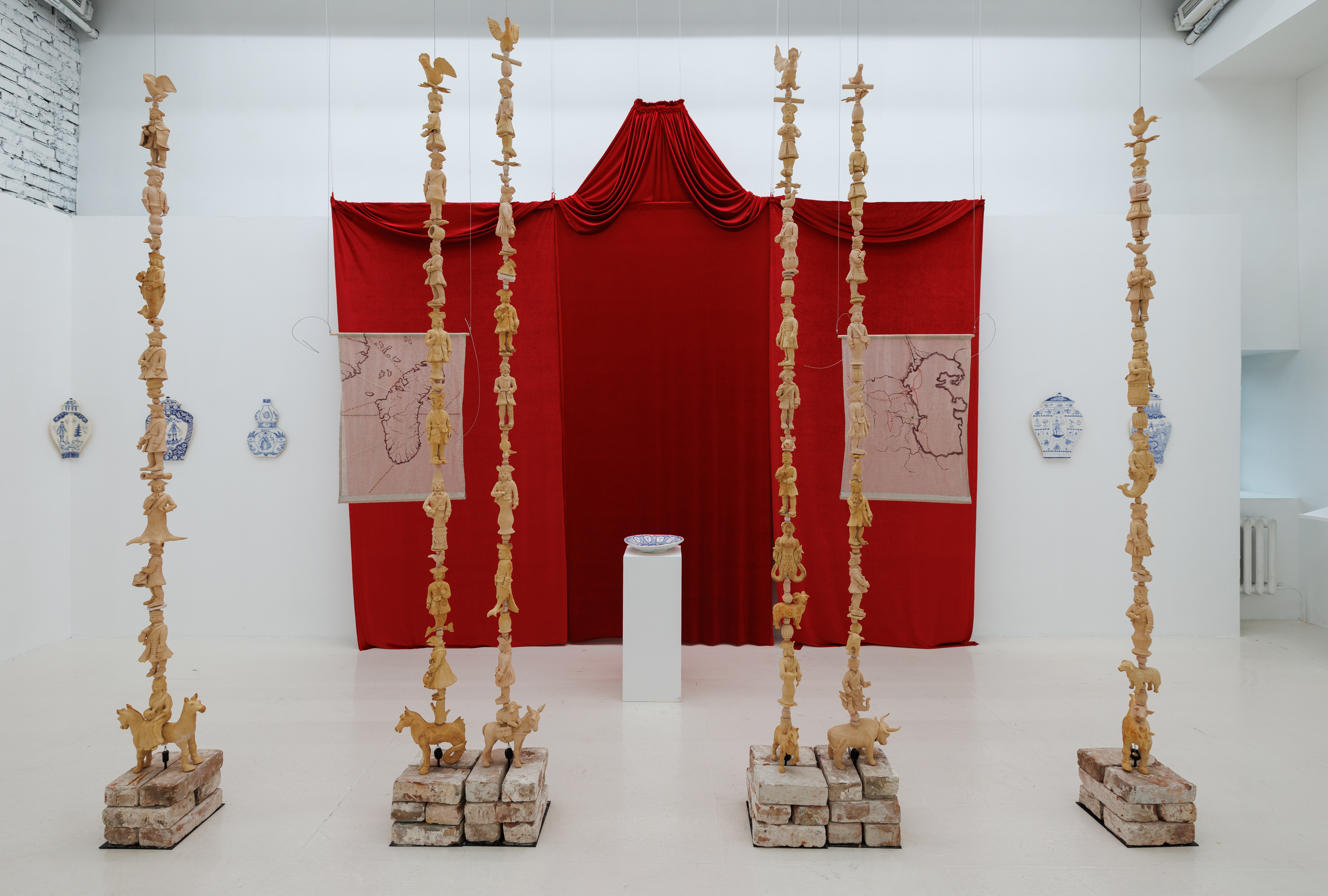 Наконец, триумфальная арка, выглядящая как восточная палатка, с ее терракотовой армией птенцов гнезда Петрова в окружении подвесных ваз, с их по-китайски понятным отношением плоскости и глубины. По стилю, иконографии и цветовому решению эти вазы ближе всего к китайскому расписному фарфору ранней династии Цинь (конец 17 века —начало 18 века), что в сочетании с фактом успеха этого фарфора на Западе в 18 веке, снова направляет внимание на неуловимую диалектику Восточного и Западного духа в границах петровского имперского проекта. Если западная империя строит триумфальную арку, то эта арка состоит из давящих глыб, а ее важнейшая функция – быть постаментом для статуи героя и рамкой для его имени. Триумфальная арка Сонина и Самородовой легка и воздушна, она величает не столько успех Государя-автократа, сколько саму страну, эту землю, сумевшую, благодаря усилиям терракотовой и кобальтовой армии, построить великую Восточную империю. Когда Восток не есть Восток. Запад не есть Запад. И вместе им сойтись в ней.