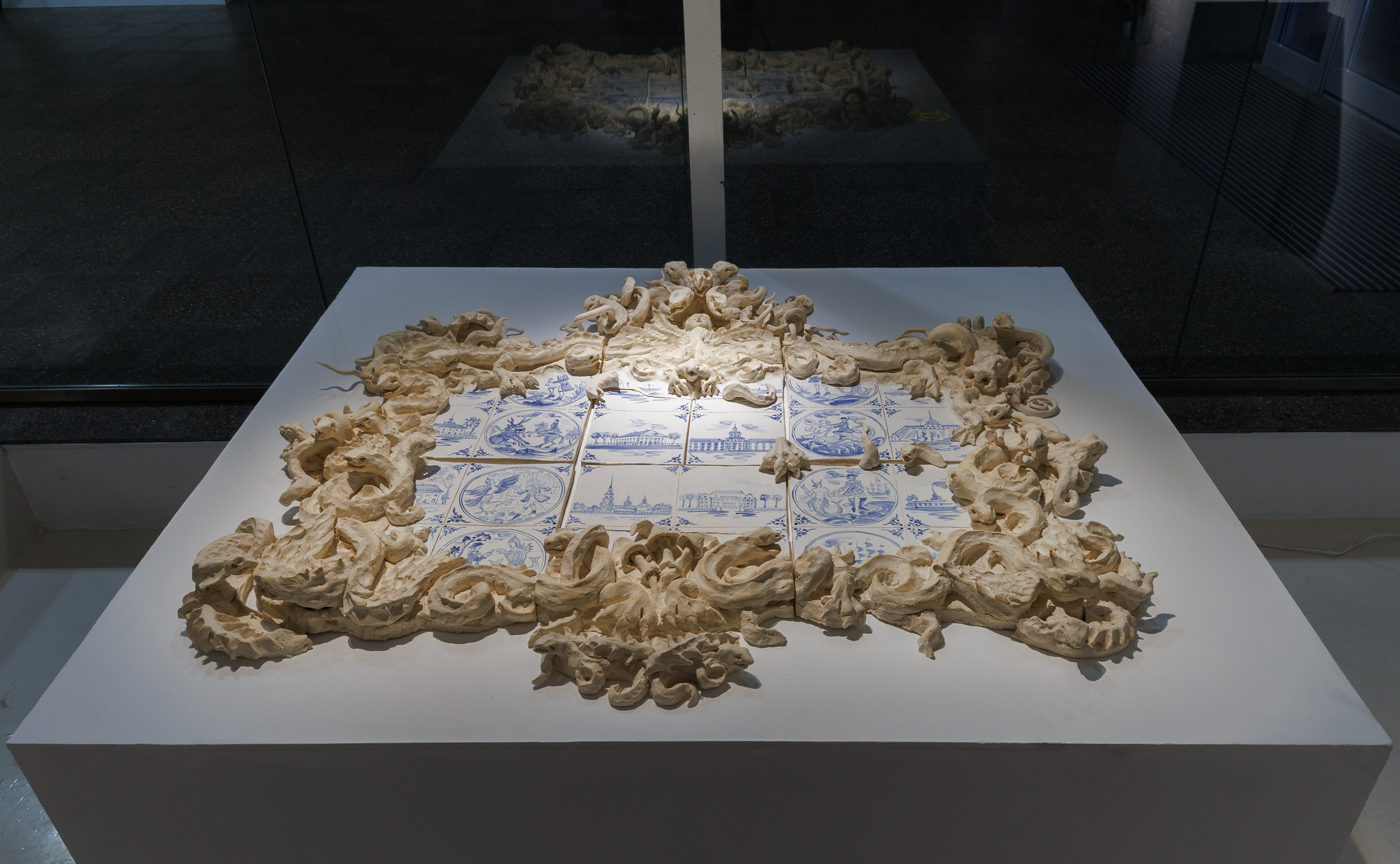 Хтоническое барокко и Пётр-Дуб продолжают раскрывать богатство отношений Восточной и Западной символической и физической материи в момент их петровской стыковки. Дуб среди камней выглядит выражением восточной дикой семантики. Он чем-то напоминает символистские картинки, но лежащая на его ветвях-плечах голова Петра с его барочной прической и европейскими усиками выглядит западной мыслью, захватившей восточный ум. Пётр, спящий в ящике, Пётр превращающийся под современную музыку в живую голограмму, Пётр, превращающийся в дуб, Пётр — полководец, плотник, мореплаватель. Пётр и петровскость тотальны, проникают в каждую пору реальности, это и есть та первая свободная клетка Восточной империи, в которой Восточное и Западное находятся в свободном диалоге. Поэтому здесь возможны и Пушкин, и Сергей Павлович Королев. Хтоническое барокко – это что-то вроде зубовской гравюры с видами Санкт-Питербюрха, только составленной из голландских плиток и помещенной в живую барочную раму. «Голубой» Парадиз очень материален: этим плиткам и через тысячу лет ничего не будет. Но только ничего не будет призраку. Он так и будет качаться над Невой, пока на него наползает хтоническая, одичавшая на болотах, барочная рама.