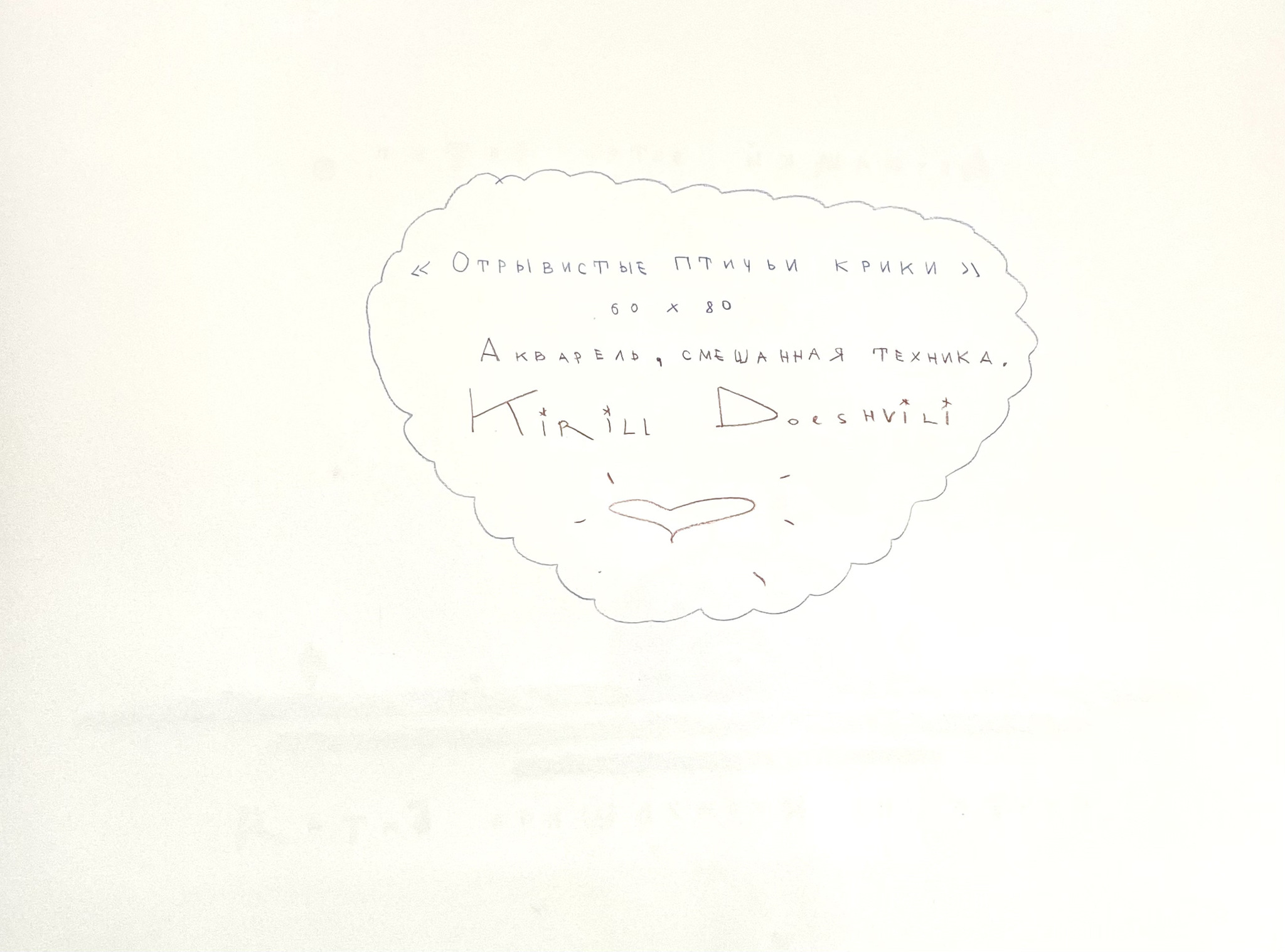 Доешвили КириллОтрывистые птичьи крики65 000 ₽Акварель, смешанная техника60 х 80 см2024КупитьКупить в 1 кликПоделитесь с друзьями О художникеКак получить?– Доставка– Самовывоз (0 рублей);Подробнее